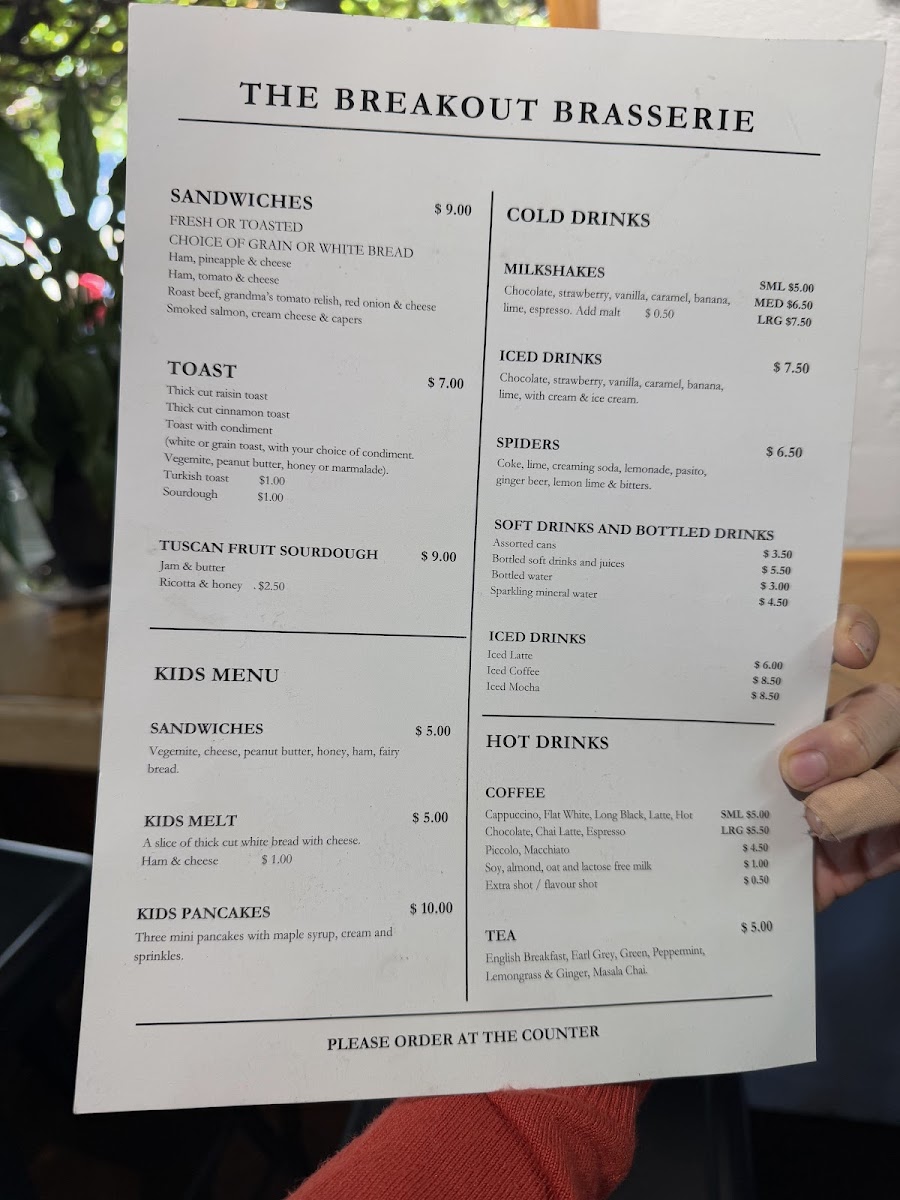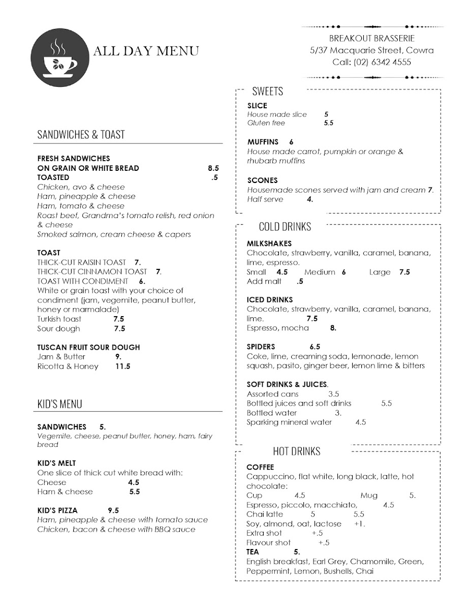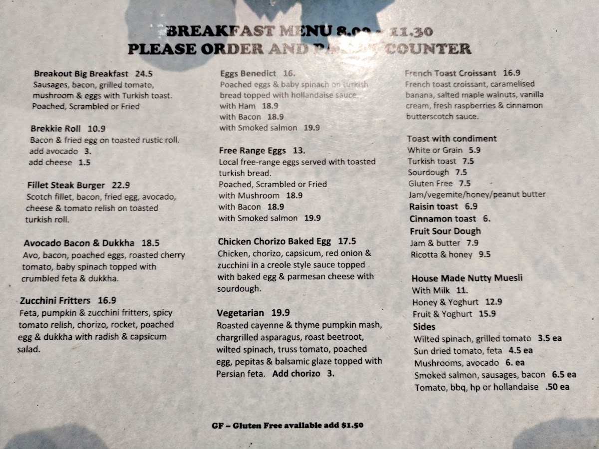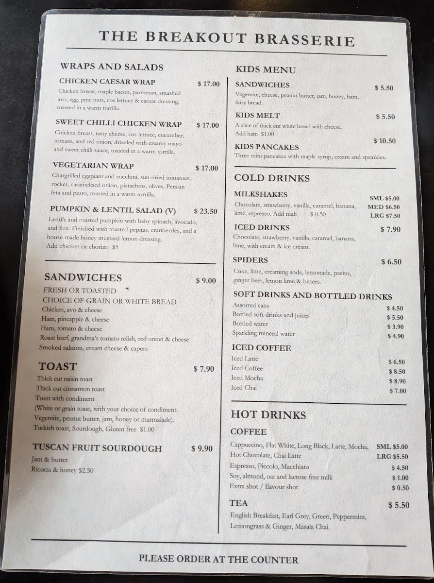 The menu at Breakout Brasserie Cafe offers a diverse selection that caters to various tastes, making it a great spot for any meal of the day. For breakfast, you can indulge in the hearty Breakout Big Breakfast or opt for lighter options like the Bacon & Egg Roll or Eggs Benedict with free-range eggs. If you're in the mood for something sweet, try the Breakout Nutty Granola or the delicious Banoffee Bliss Waffles. Burgers include the satisfying Scotch Fillet Burger and the popular Breakout Club Sandwich. The cafe also offers light meals such as the savory Sweet Corn Fritters and flavorful Breakout Beef Nachos. For a quick bite, you can enjoy one of their freshly made sandwiches or toast, including choices like Chicken, Avo & Cheese or Roast Beef, Smoked Salmon, Cream Cheese & Capers. Wraps and salads are also available, with options like the Chicken Caesar Wrap and Pumpkin & Lentil Salad. The kids' menu offers simpler, smaller portions such as the Kids Melt and Kids Pancakes. If you're craving a sweet treat, the cafe has a variety of Slices, Banana Bread, and Scones. To pair with your meal, there are hot drinks like Cappuccino and Flat White, or cold beverages like Milkshake and Iced Chocolate. Whether you're visiting for a casual breakfast or a light meal, Breakout Brasserie Cafe offers an inviting and tasty menu that will satisfy every craving.