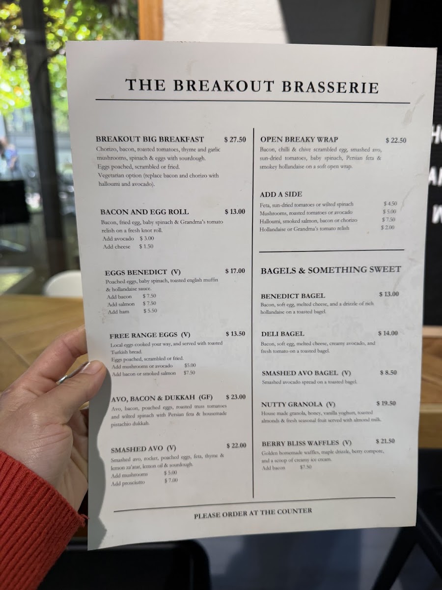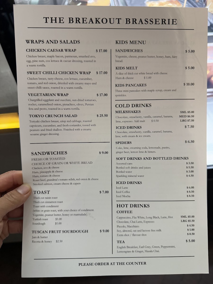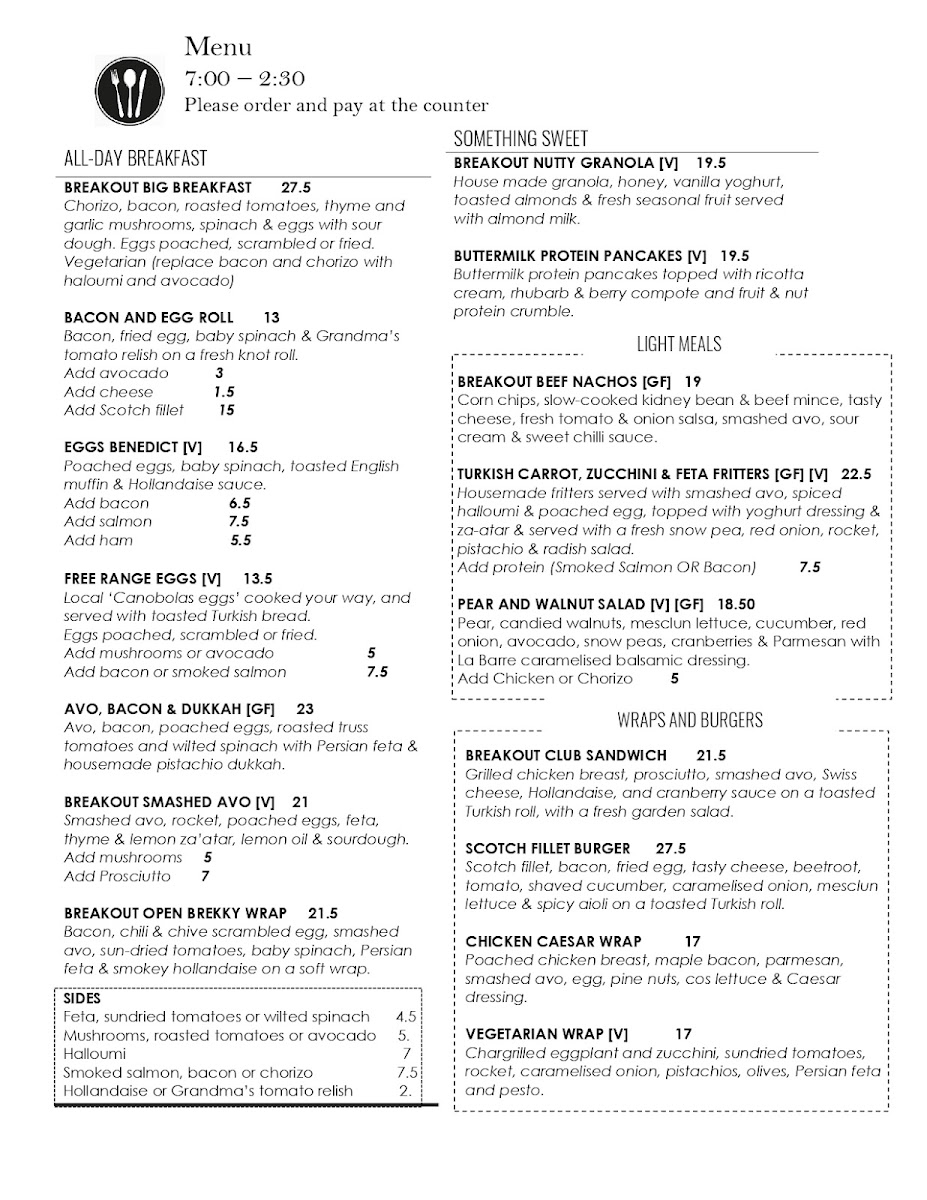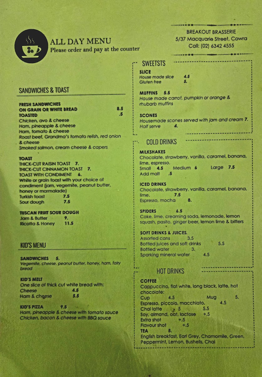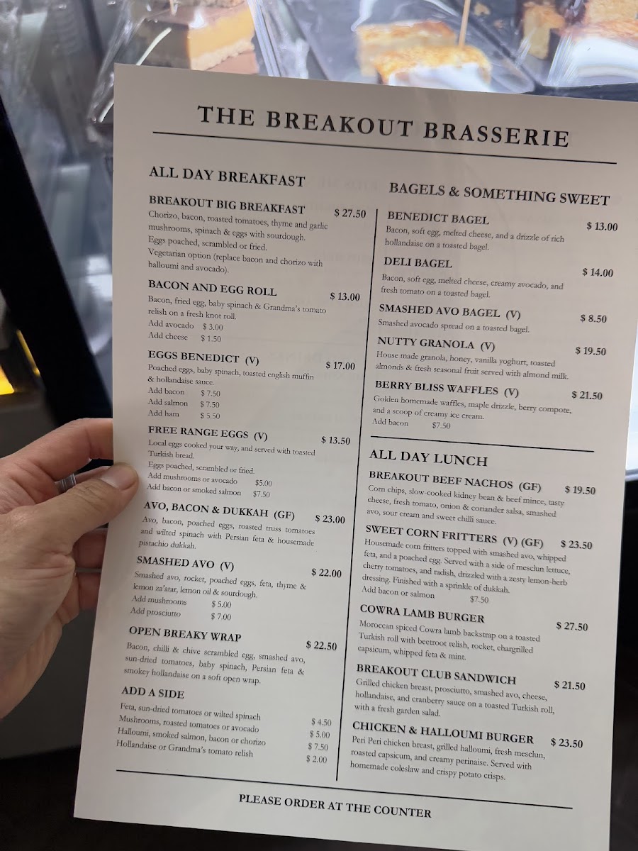 The menu at Breakout Brasserie Cafe offers a diverse selection that caters to various tastes, making it a great spot for any meal of the day. For breakfast, you can indulge in the hearty Breakout Big Breakfast or opt for lighter options like the Bacon & Egg Roll or Eggs Benedict with free-range eggs. If you're in the mood for something sweet, try the Breakout Nutty Granola or the delicious Banoffee Bliss Waffles. Burgers include the satisfying Scotch Fillet Burger and the popular Breakout Club Sandwich. The cafe also offers light meals such as the savory Sweet Corn Fritters and flavorful Breakout Beef Nachos. For a quick bite, you can enjoy one of their freshly made sandwiches or toast, including choices like Chicken, Avo & Cheese or Roast Beef, Smoked Salmon, Cream Cheese & Capers. Wraps and salads are also available, with options like the Chicken Caesar Wrap and Pumpkin & Lentil Salad. The kids' menu offers simpler, smaller portions such as the Kids Melt and Kids Pancakes. If you're craving a sweet treat, the cafe has a variety of Slices, Banana Bread, and Scones. To pair with your meal, there are hot drinks like Cappuccino and Flat White, or cold beverages like Milkshake and Iced Chocolate. Whether you're visiting for a casual breakfast or a light meal, Breakout Brasserie Cafe offers an inviting and tasty menu that will satisfy every craving.